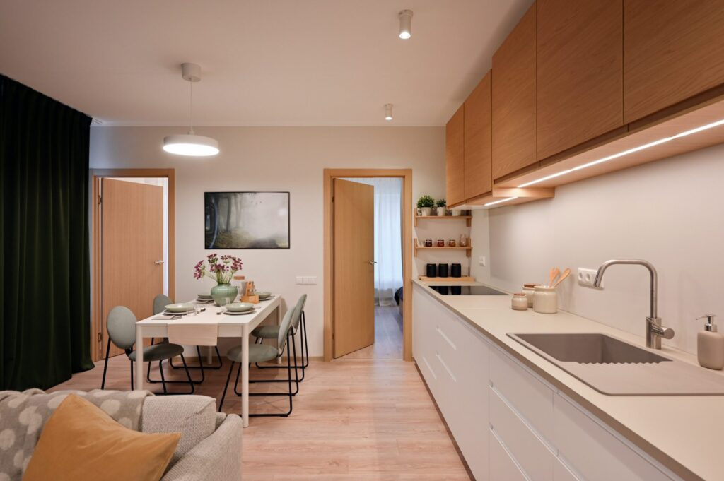 • Dzīvojamās istabās, virtuvēs un guļamistabās lamināta grīda segums ar skaņas izolējošo kārtu.